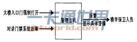 (3)实时监控功能:楼宇的物业管理部门通过小区对讲管理主机,能对小区内各楼宇对讲门禁系统的实时境况进行监控。假设有某楼宇入口的大门被强制打开或对讲门禁系统某处出现了故障,楼宇对讲管理主机会立刻发出报警信号并同步显示出警情的内容和报警的楼号及房间号,物业管理部门得到该信息后能快速出警处理。对讲门禁系统实时监控功能示意图如图1所示。