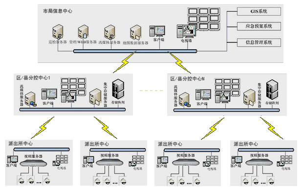 B.系统结构:全市社会治安科技防范系统分三级治安防范监察:市局层面的一级治安防范监察,区县分局层面的二级治安防范监察,派出所的三级监控。监控图像原则上采用自下而上的组织模式。即各派出所各自组建图像监控系统,采用DVR进行H.264编码、本地短时间的存储,并负责本地监控的使用管理。各视频监控图像经过H.264编码后通过光纤接入到管辖区县分局;各驻地的监控图像按属地直接接入当地区县分局,复杂区域的报警柱直接接入当地区县分局,区县分局实现对属地内的图像实时监视、切换控制、浏览查询、抓拍和储存,达到其实战应用的要求。市局层面的监控图像主要从区县分局的监控汇接点上传而来,供一级监控使用,一级治安防范监察可同时调看控制任意监控点的图像。