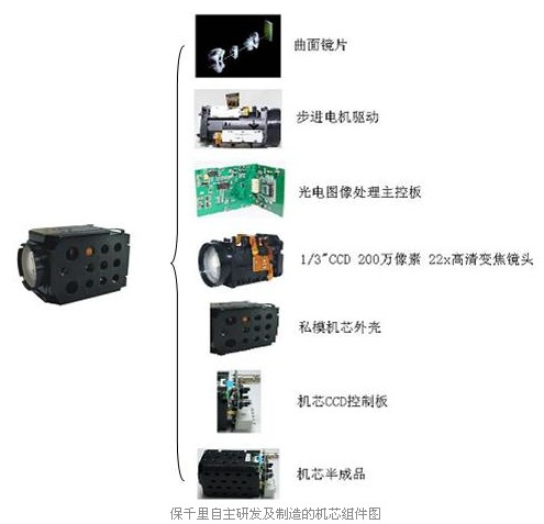 可在保千里取得研发成果之前,机芯的大壁江山被进口的日本索尼、日立、三洋和韩国LG、三星、CNB等掌控,占机芯成本一半的镜头又被长野、腾龙、佳能等日本企业所垄断,CCD、CMOS等关键元件又被SONY或美国等其他国家跨国集团独占,而高端自动对焦的算法和高端夜视补光等核心技术在国内仍属空白。就机芯而言,关键的技术在镜头、自动对焦、成像器件三方面。而面对如此境况,保千里作为国内优秀民族安防企业,坚持以“科技创造价值”为企业使命,不断创新,是国内率先从主控板、镜头、光学设计及生产完全自主完成的企业。