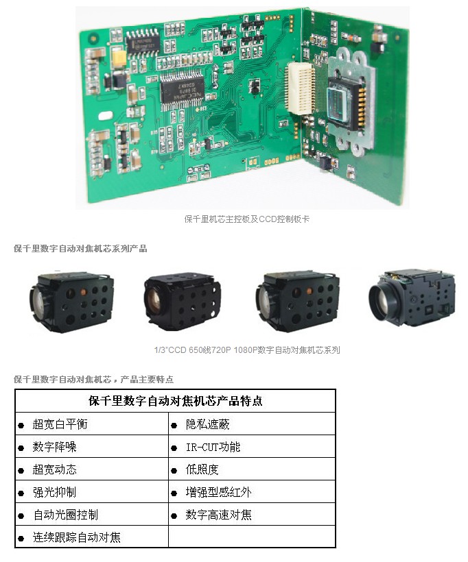 在镜头上,全世界主要是日本腾龙、长野和佳能。除此以外,保千里是第四家,也是国内首家能自己设计和生产的企业。保千里镜头在技术上有自动光圈、IR-CUT切换、多层镀膜、非球面、低色散、大光圈、光圈是F1.6-F3.2 ;整体优势,全功能,高性价比小体积型变焦镜头。